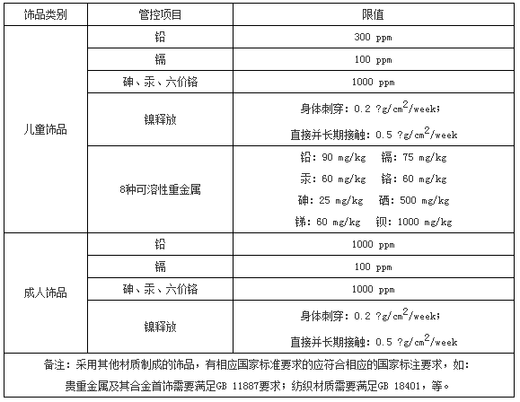 除了对普通金属饰品有管控之外,我国对贵重金属饰品中的有毒有害物质也有管控,如标准GB 11887-2008《首饰 贵金属纯度的规定及命名方法》。该标准规定了有害重金属铅、镉、汞、砷、六价铬及镍释放的限量要求。